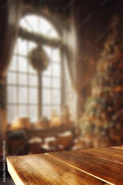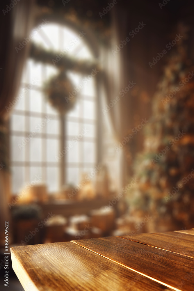 Desk of free space and winter background of christmas tree. Empty space for your decoration and home inteiror.