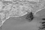 Soft ocean wave on tropical sandy beach and stone in summer background. Close up