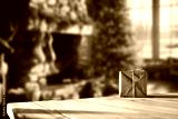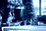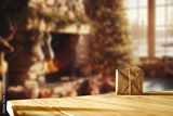 Winter mockup of wooden desk and christmas gifts. Santa Claus home interior with fireplace and christmas tree.