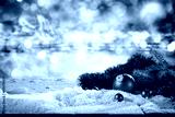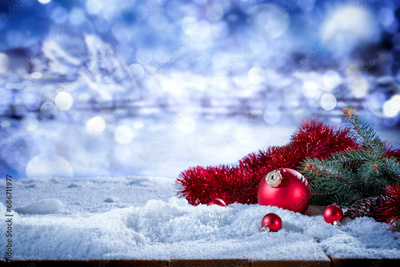Winter board cover of snow and frost with blurred landscape of mountains.