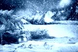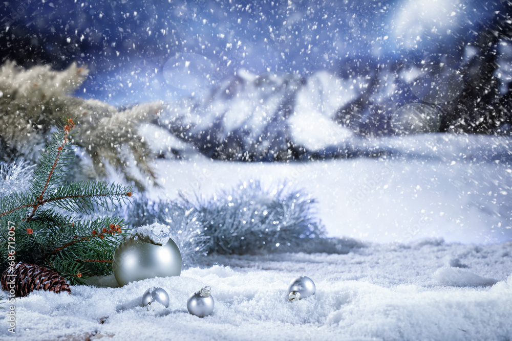 Winter board cover of snow and frost with blurred landscape of mountains.