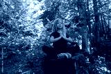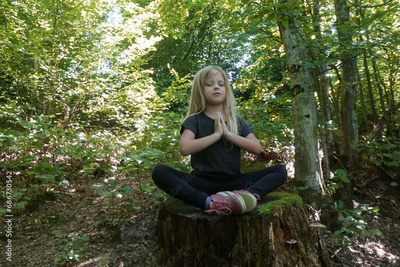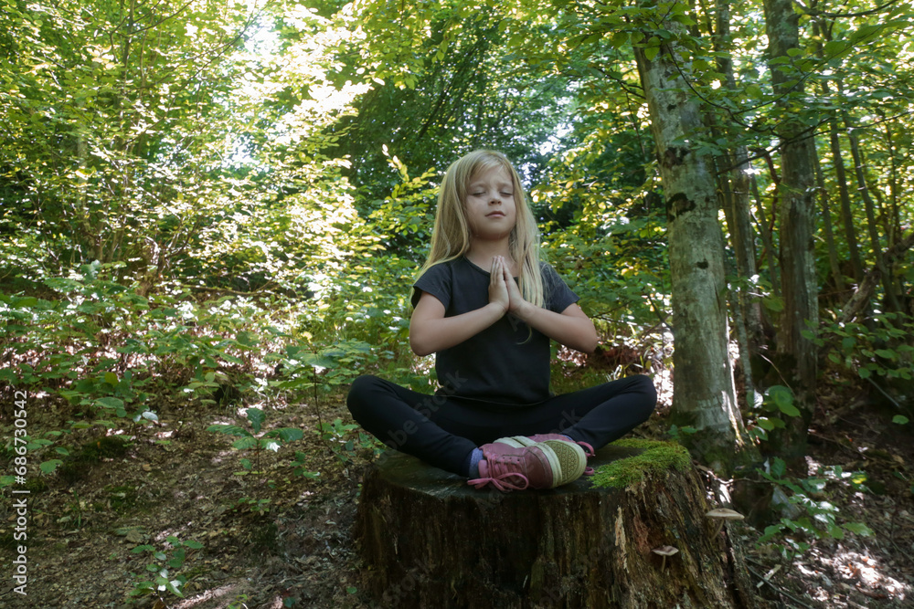 Little girl in lotus position sitting on the tree stump. Forest meditation concept. Peace, mindfulness and relaxation in nature.