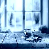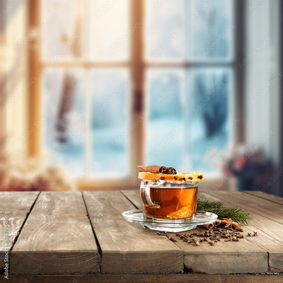 Desk of free space and christmas mulled on top. Winter window background.