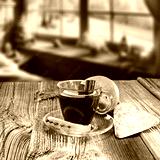 Table background of free space for you decoration. Kitchen interior and christmas time. Board of empty space and sun light with shadows. December composition.