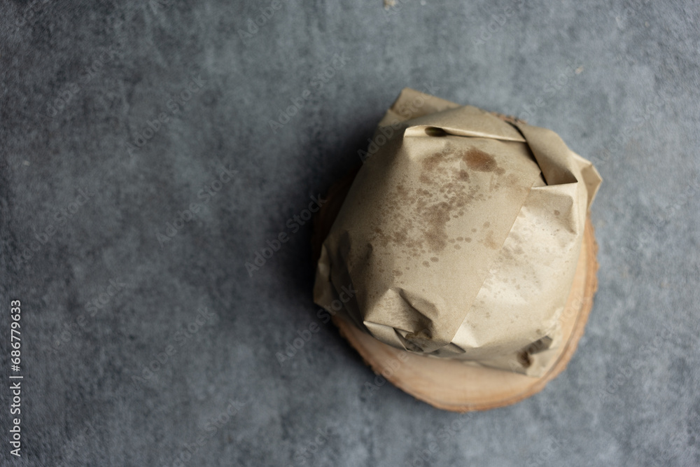 Craft brown paper packages, package box for hamburgers. Delivery concept. Eco packages concept.