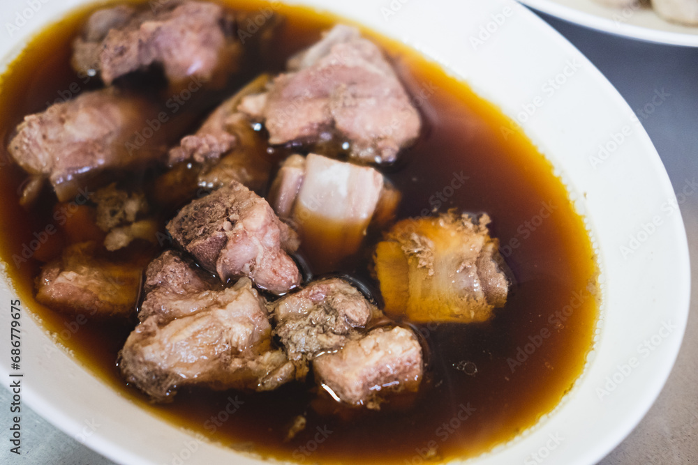 Braised pork or stewed pork in a white bowl that is popular in Thailand eating with rice or noodles. Close up