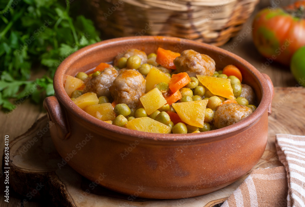 Turkish Food Green Pea Stew with Meatballs - Kofte or Kofta Bezelye. (Turkish name; kofteli bezelye)