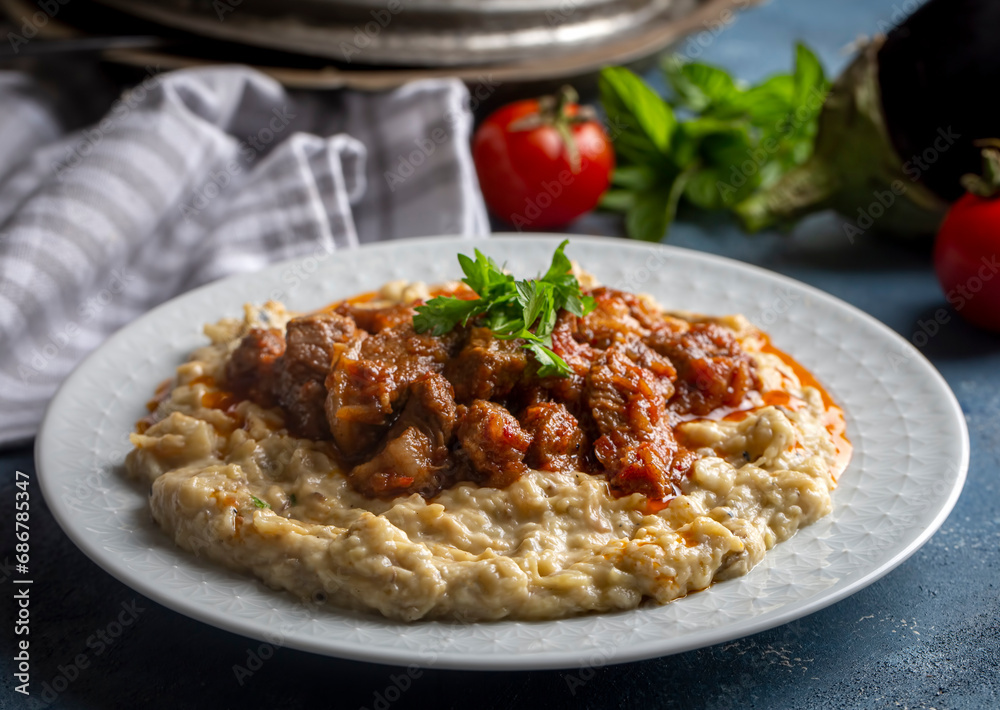 Turkish Food Hunkar Begendi made with Eggplant and Meat.