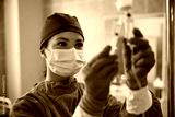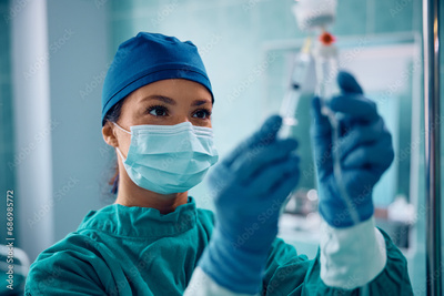 Surgical nurse injecting medicine through IV drip in operating room.