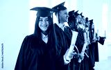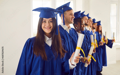 Portrait of young smiling joyful girl student in university graduate gown and diploma in hands. Happy graduated woman standing with classmates indoors. Graduation celebration and education concept.