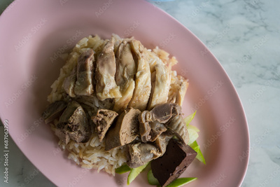 Boiled chicken, offal with cucumber sliced eating with rice and spicy or sweet sauce.