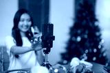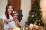 Young asian vj women using digital smartphone to recording video and speaking morning talks about news in live streaming on channel while drinking coffee and working with happiness at home studio