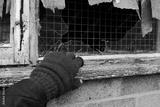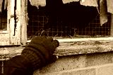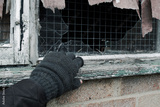Concept of a would-be thief wearing knitted gloves about to enter an abandoned building on an English housing estate known for high rates of crime.