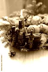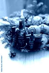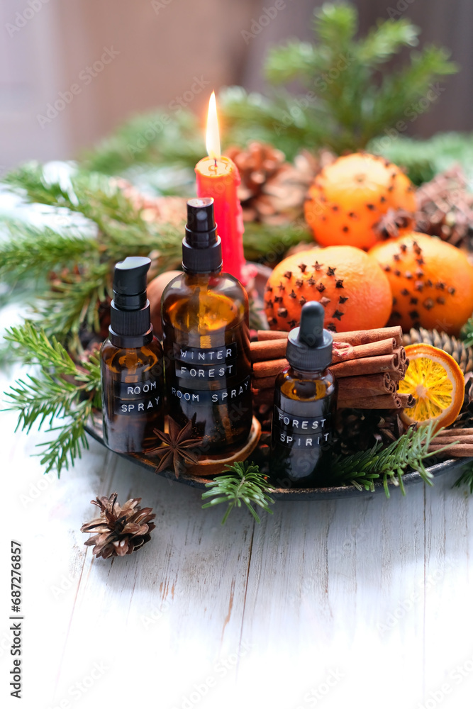 Homemade natural aroma spray for winter season. glass bottles, citrus fruits, cones, fir branches on table close up. Sustainable lifestyle, zero waste ecological product for aromatherapy. soft focus