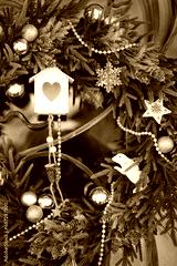 Christmas winter background. Decorative bright christmas wreath hanging on house door close up. Beautiful Festive decor for Christmas, New Year holidays. symbol of winter season