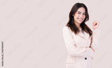 Confident business young women in pink suit with arms crossed and smile isolated over pink background Young business lady arms crossed self confident person worker friendly smile looking at camera