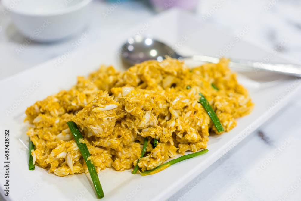 Stir fried crab with curry powder. Seafood cuisine and food travel