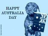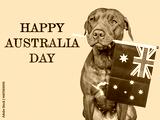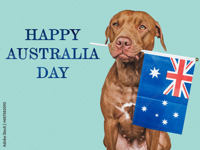 Happy Australia Day. Lovable, charming dog and Australian Flag. Closeup, indoors. Studio shot. Congratulations for family, loved ones, relatives, friends and colleagues. Pet care concept