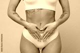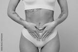 Close up cropped young nice lady woman with slim body perfect skin wear nude top bra lingerie stand put hands arm on belly in heart shape isolated on plain beige background Lifestyle diet fit concept