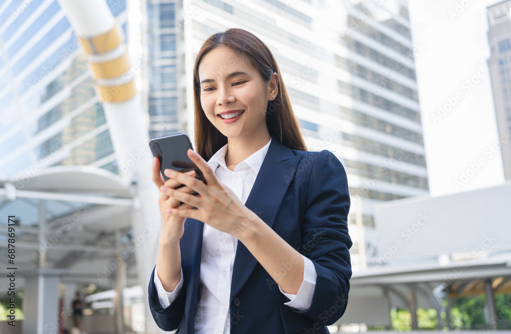 Smiling asian businesswoman holding smartphone while standing in front of modern business building, Concept of using the phone to communicate anywhere.