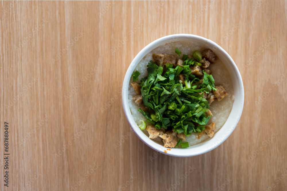 Pork congee or rice porridge with minced pork sprinkled with coriander in white bowl for new morning. Asia breakfast