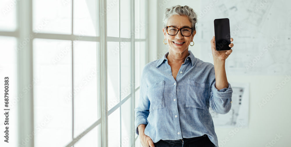 Recommended by an expert: Successful female architect showing a smartphone in her office