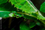 Beautiful large drop morning dew in nature, Drops of clean transparent water on leaves. Image in green tones. Spring summer natural background.