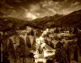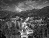 Aerial view of road, snowy mountains, street lights, forest in snow, purple sky at night in winter. Top drone view of alpine village, houses, illumination, highway, cars, pine trees at dusk. Slovenia