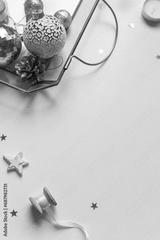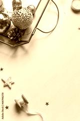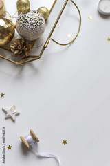 Christmas celebration concept frame with golden and white decoration on the table. Copy space