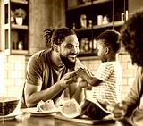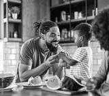 child family kitchen food boy son father mother watermelon fruit slice summer organic meal fun preparing healthy diet eating home black
