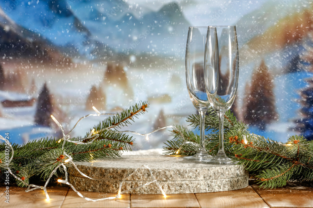 Champagne glasses on wooden table and empty space for your product. Winter landscape of mountains. New year time and mockup for your decoration.