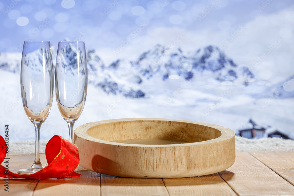 Champagne glasses on wooden table and empty space for your product. Winter landscape of mountains. New year time and mockup for your decoration.