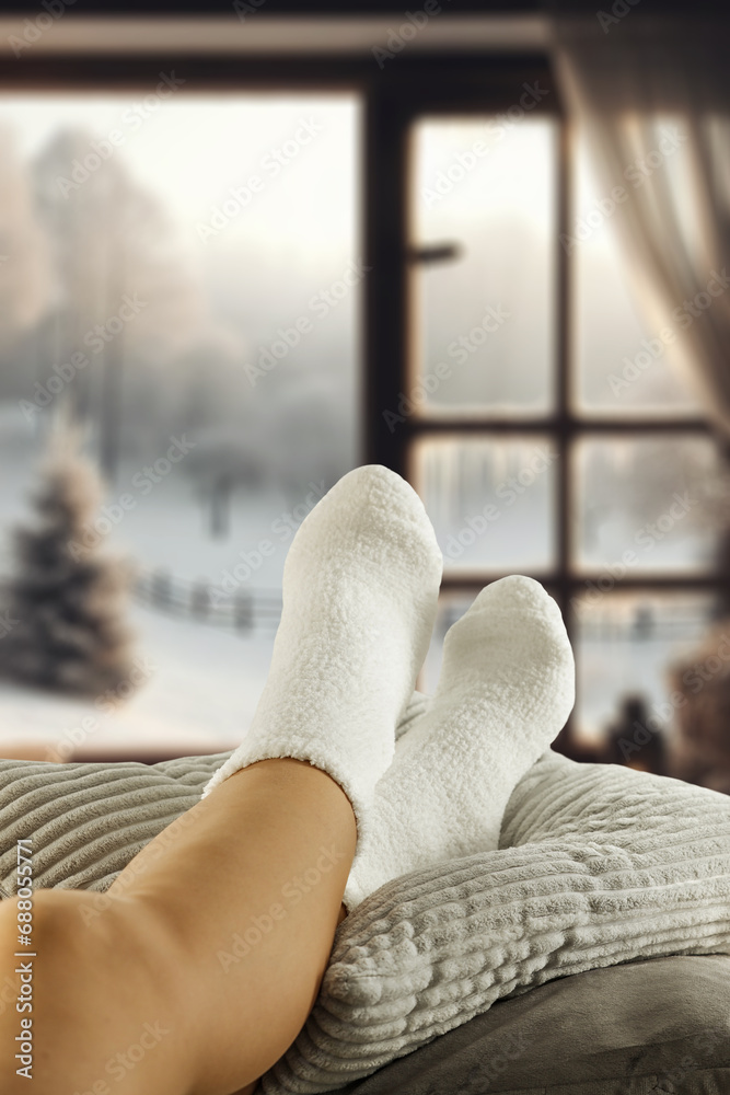 Woman legs with warm winter socks. Free space for your decoration. Window background in home interior and chrismtas time. Mockup background and cold december time.