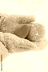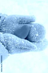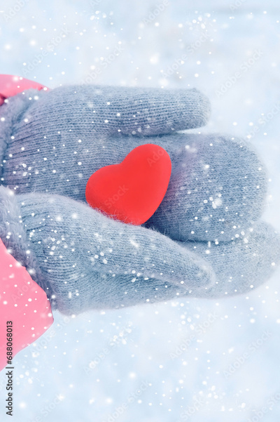girl in pink jacket holding red heart model, symbol of love, gray woolen mittens in her hands, winter background and white snow, concept of confession, Valentine's Day