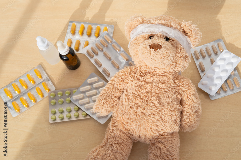 teddy bear with bandaged head, surrounded by scattered medicines and pills, health, care and treatment children through soft toy, medical therapy and pediatrics