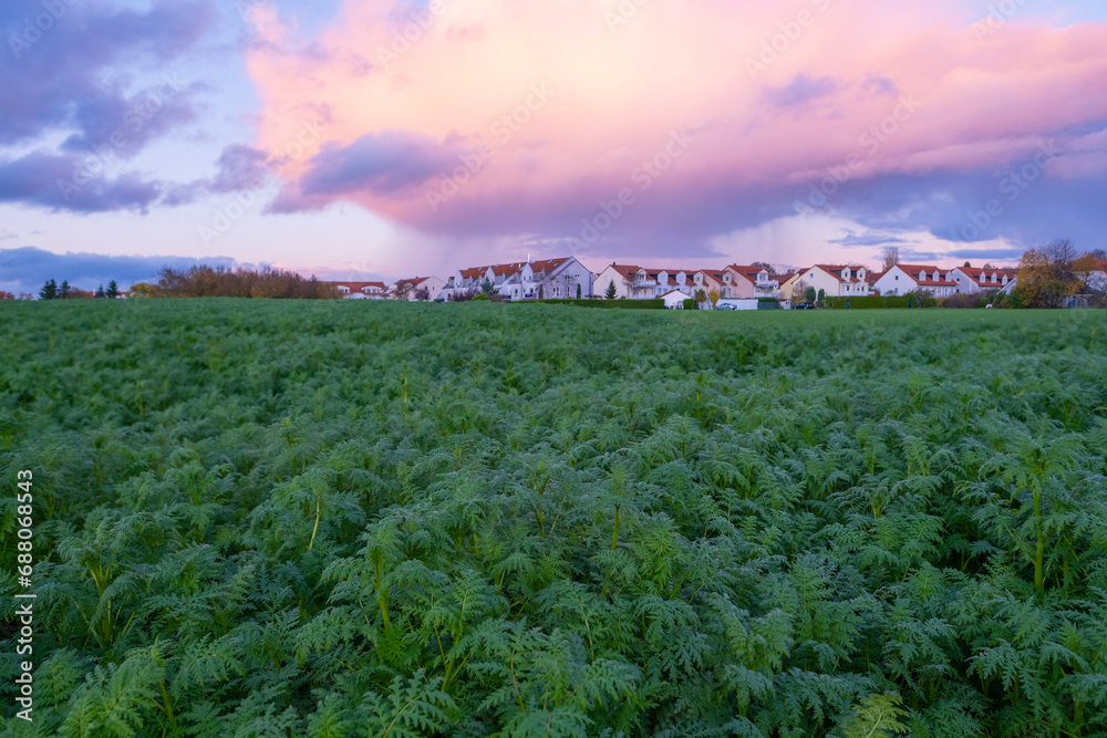 Beautiful sunset sky over village and green fields with winter phacelia tansy, Phacelia tanacetifolia, annual herbaceous plant in field, role of Phacelia in sustainable farming, Environmental plants