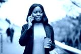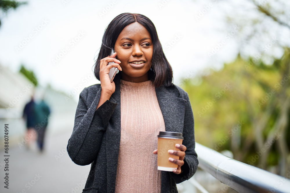 Young Black career woman with takeaway coffee talking on cell phone, urban area.