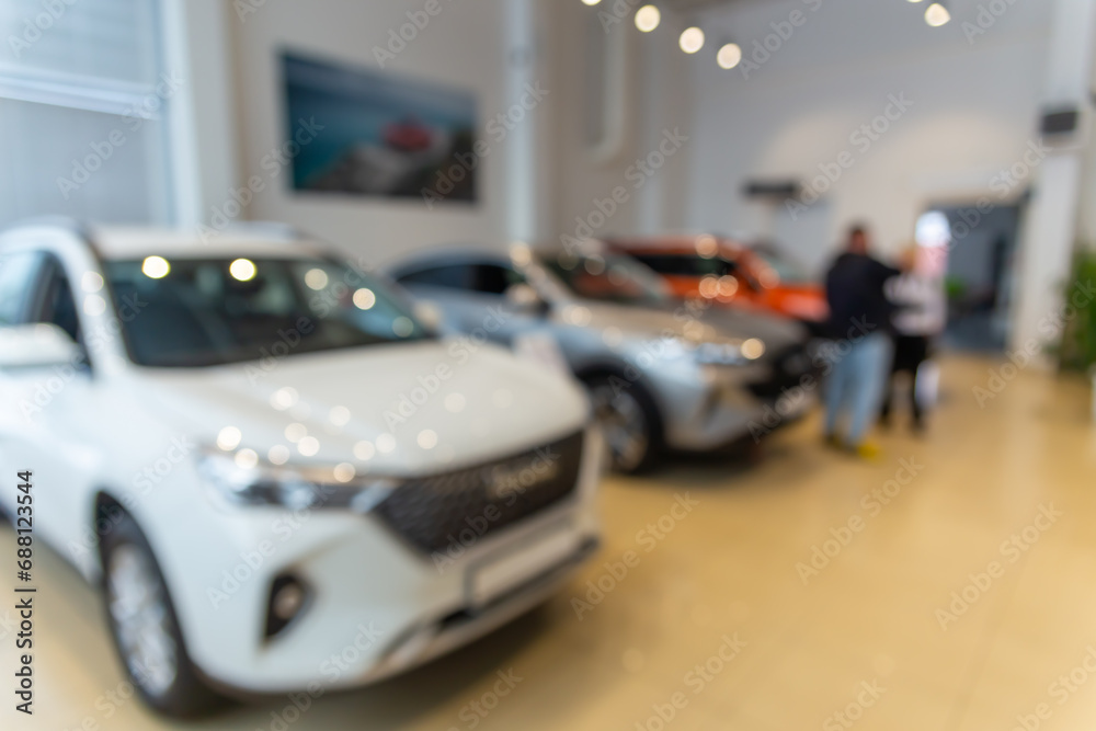Blurred new car parked in modern showroom waiting for sales.