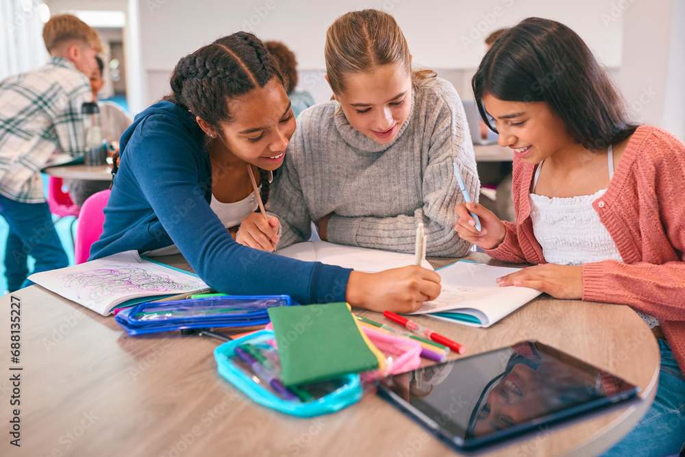 Three Female Secondary Or High School Students Collaborating In Study Area