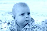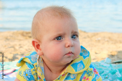 A small child is lying on the sea shore