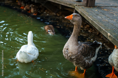 Grey goose in the pond, domestic farm animals