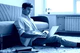 Attractive curly haired boy, teenager using laptop computer communication online sitting at home. Young student studying, learning language, exam preparation. Education concept