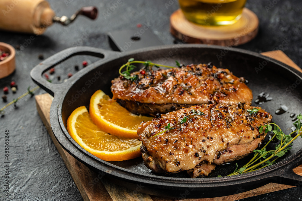 roasted duck meat steak with oranges and thyme in a pan. on a dark background. top view. copy space