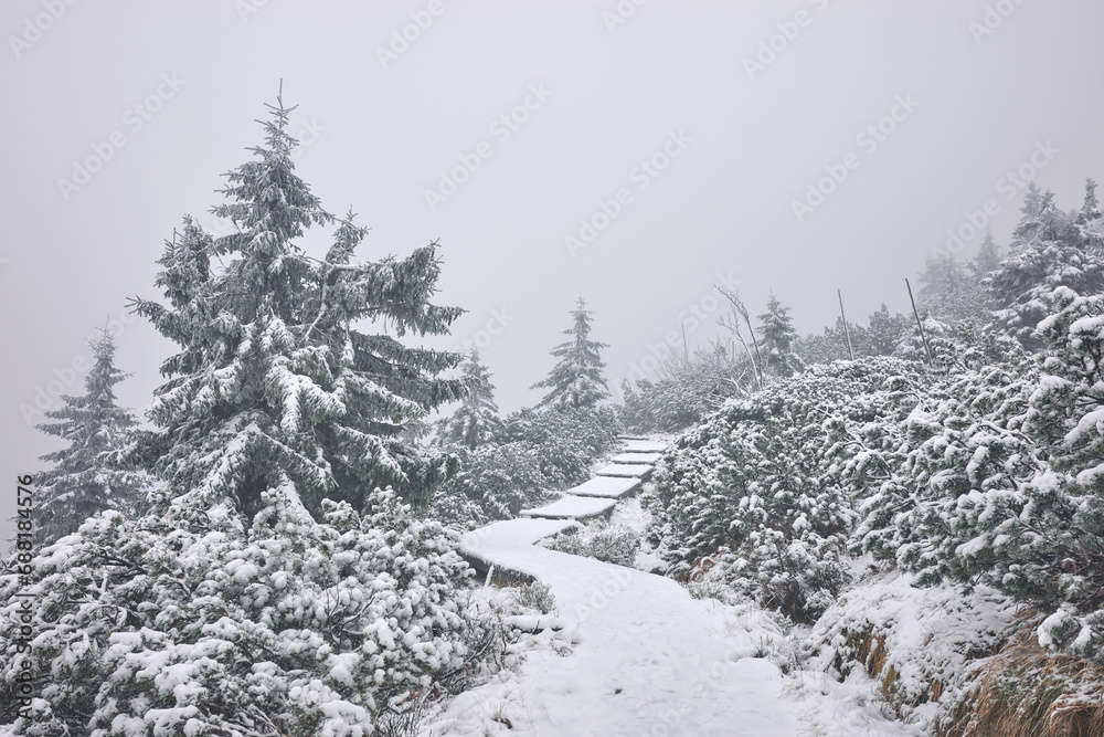 Winter mountain landscape of the Karkonosze Mountains, color toning applied, Poland.