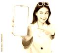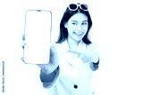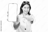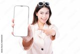 Happy Excited young Asian woman point finger to mobile phone isolated on white background copy space Young girl use smartphone for Shopping online Chat Texting message winning prize Show phone screen