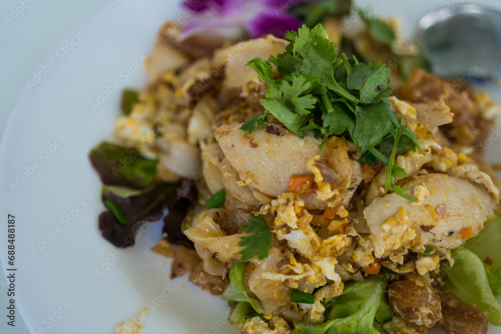 Stir fried rice flour noodle with chicken. Street food in Thailand