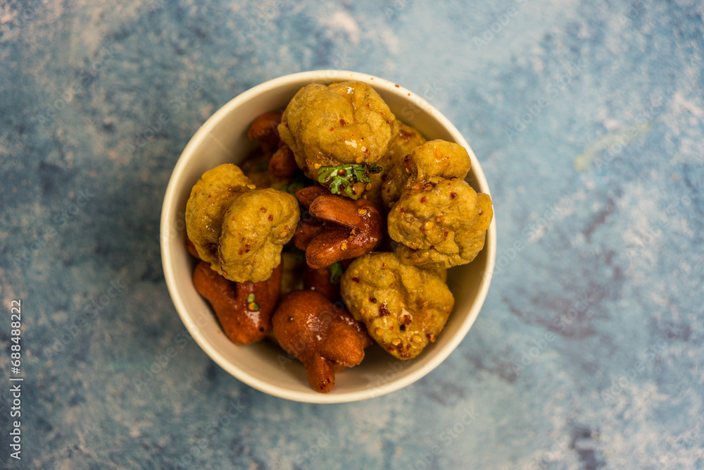 Fried meatballs and hotdog with spicy dipping sauce in a white bowl. Thai street food style