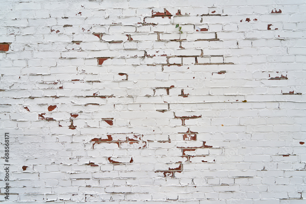 Old white brick wall with peeling paint as background texture
