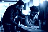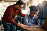 Caring businessman consoling his distraught black female colleague while she's working on desktop PC in office.