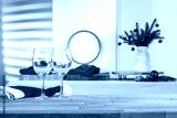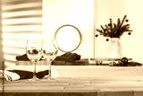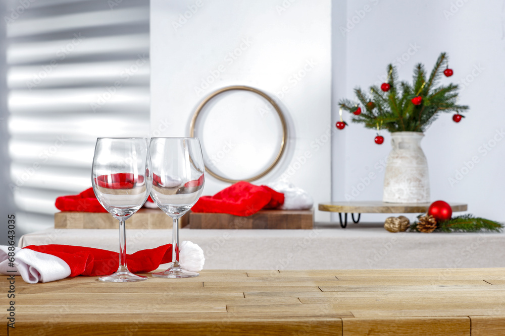 Table background of free space for you decoration. Kitchen interior and christmas time. Board of empty space and sun light with shadows. December composition.